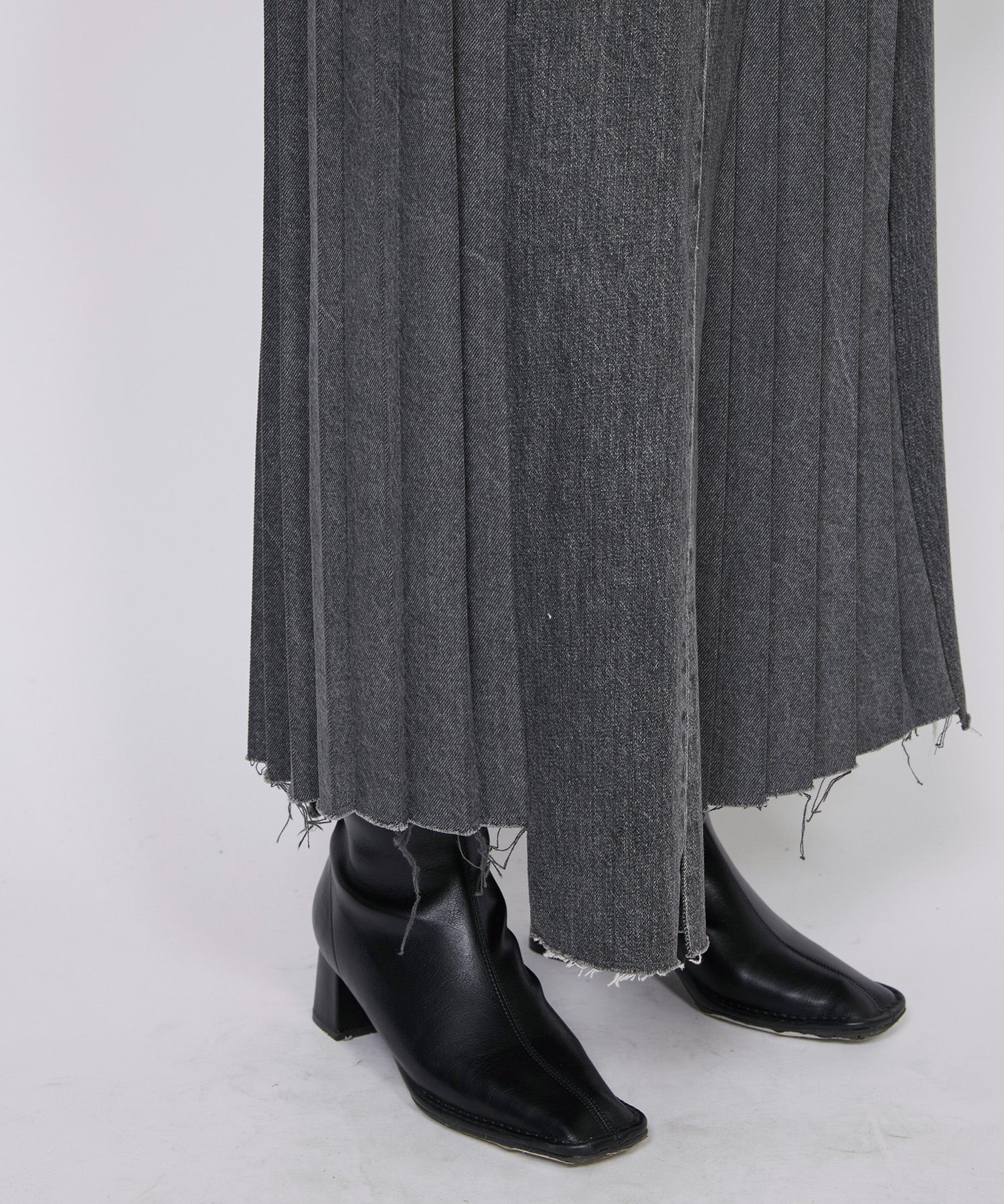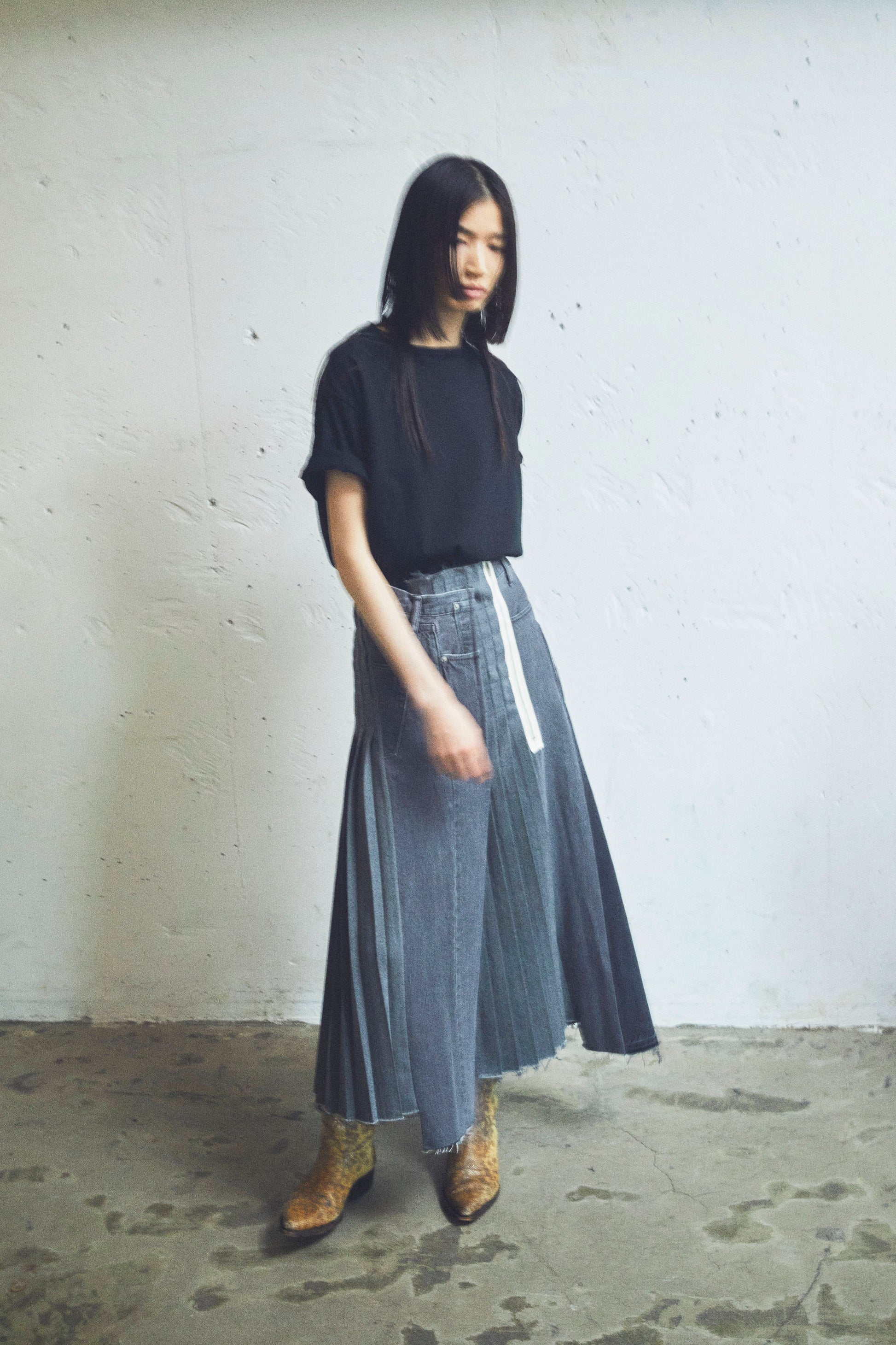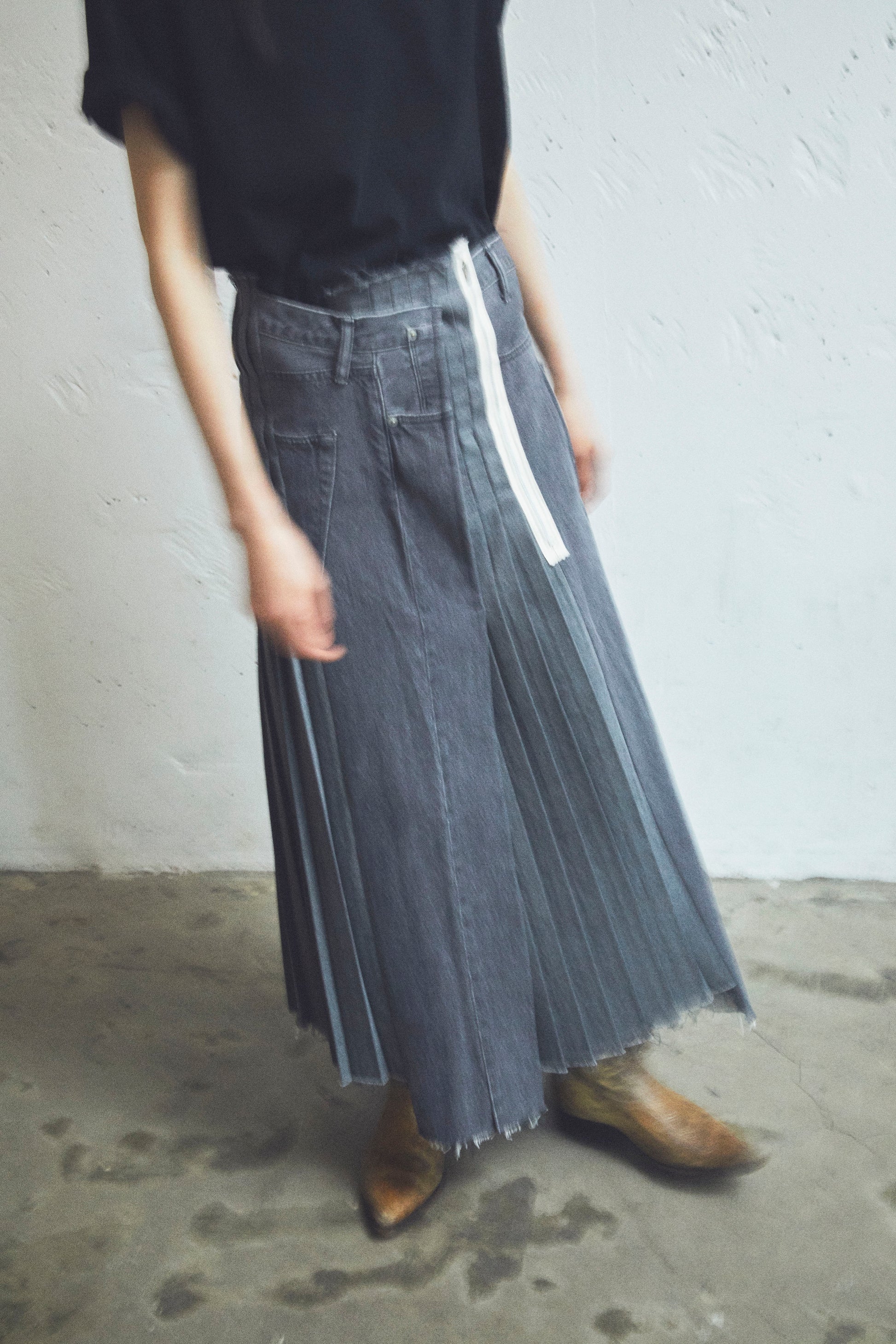 形状記憶されたコットン100%のプリーツを使用したリメイクプリーツスカート。デニムパンツを解体しプリーツを差し込み作りこまれる。アトリエにて職人が一人で全ての工程を縫い、組み合わせ仕上げています。鮮やかで深みのある色のデニムをベースにパンツ3本を解体し、縦のラインを生かした切り替えは、色を同色系に統一しトーンを抑えています。