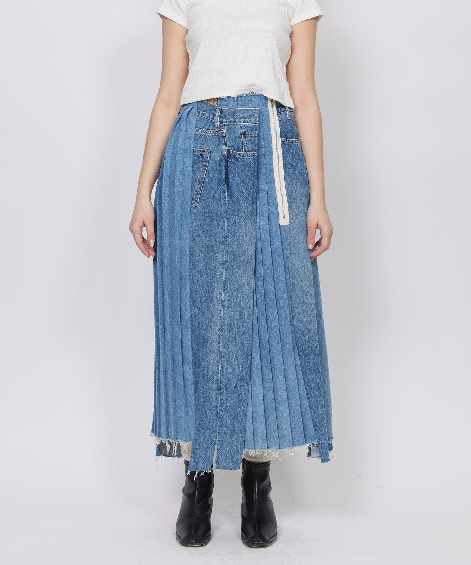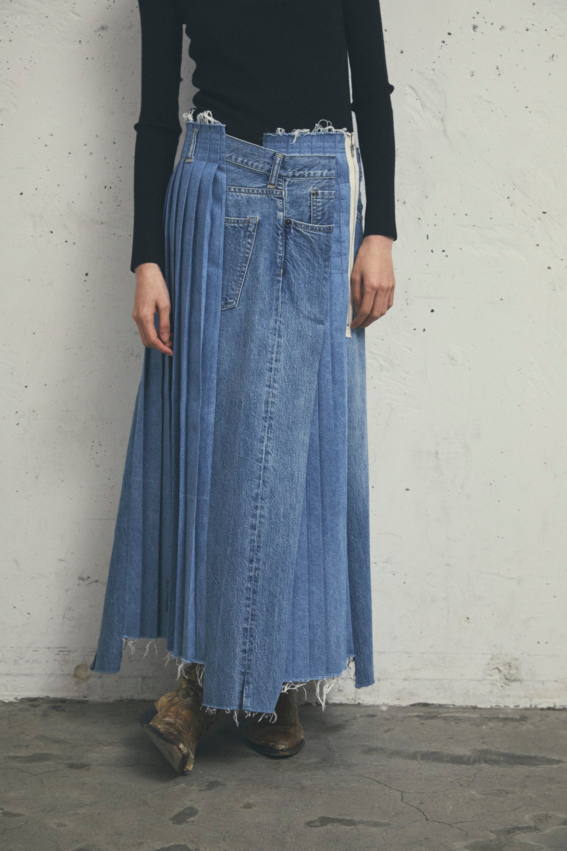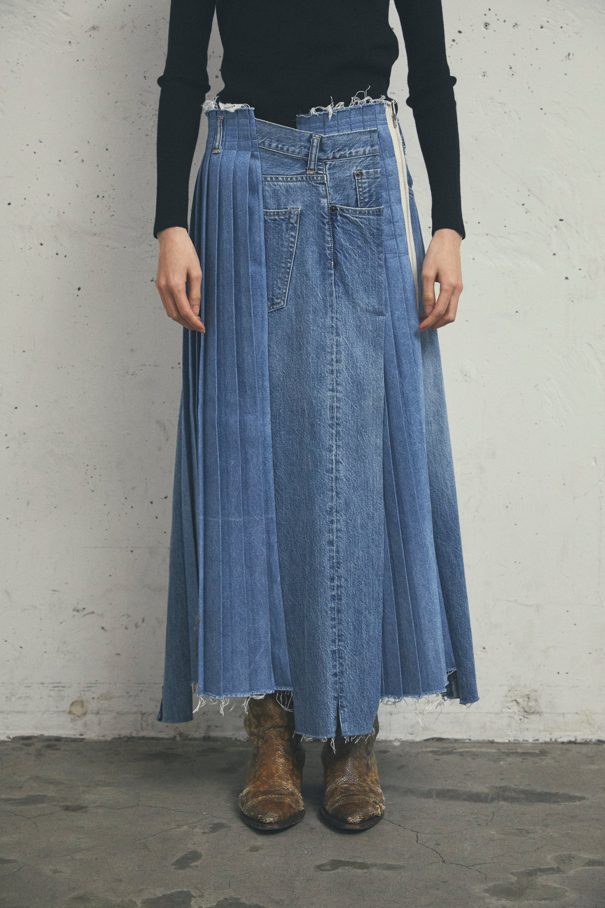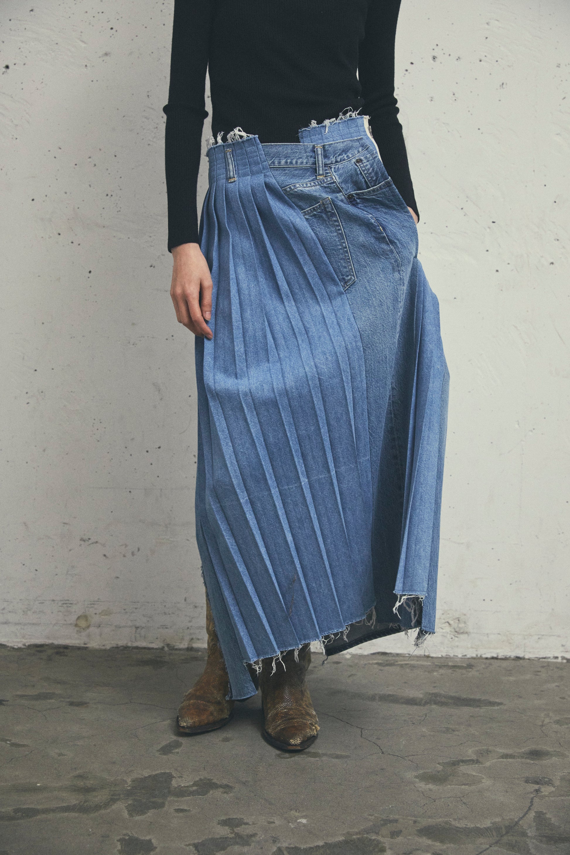 形状記憶されたコットン100%のプリーツを使用したリメイクプリーツスカート。デニムパンツを解体しプリーツを差し込み作りこまれる。アトリエにて職人が一人で全ての工程を縫い、組み合わせ仕上げています。鮮やかで深みのある色のデニムをベースにパンツ3本を解体し、縦のラインを生かした切り替えは、色を同色系に統一しトーンを抑えています。