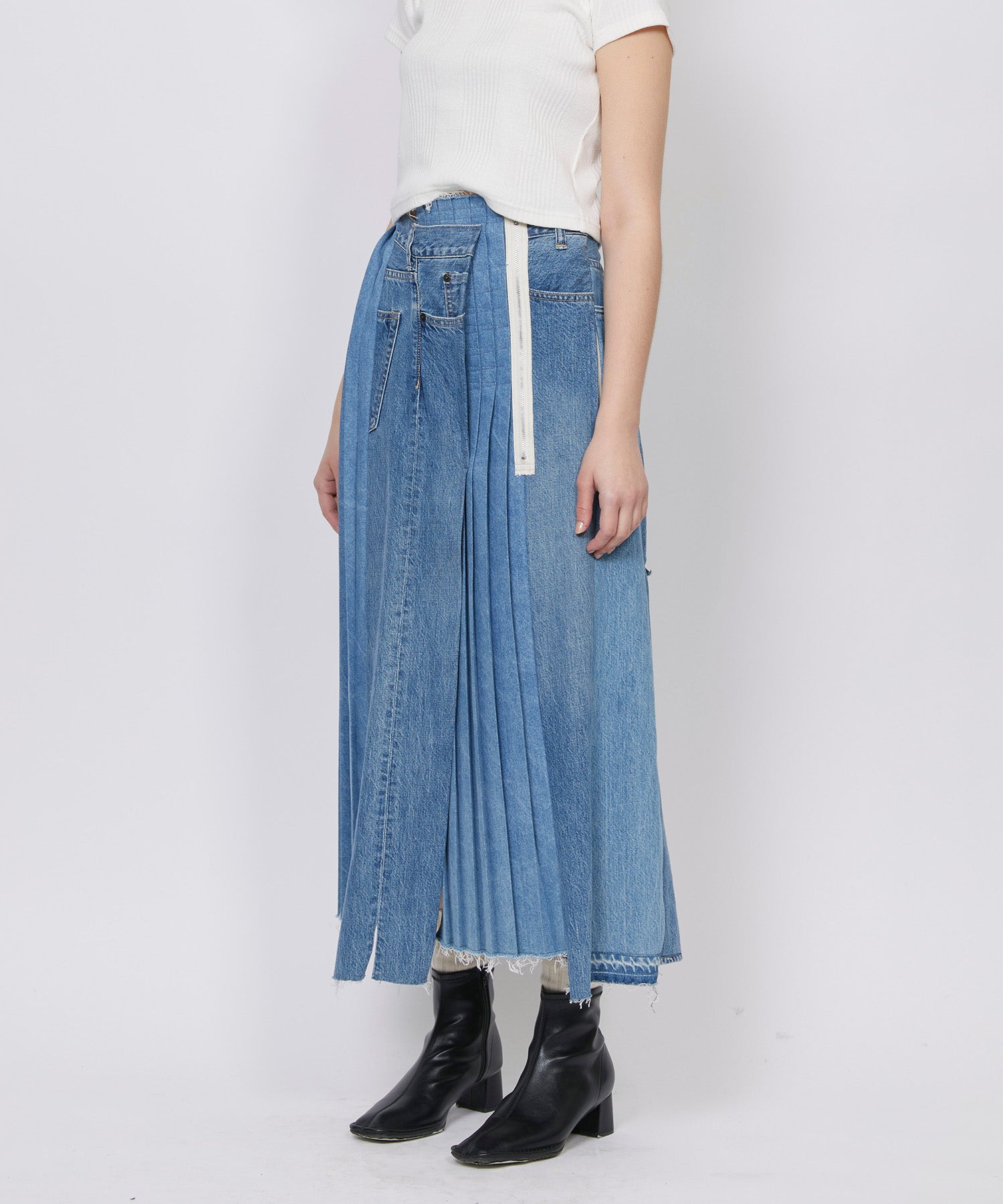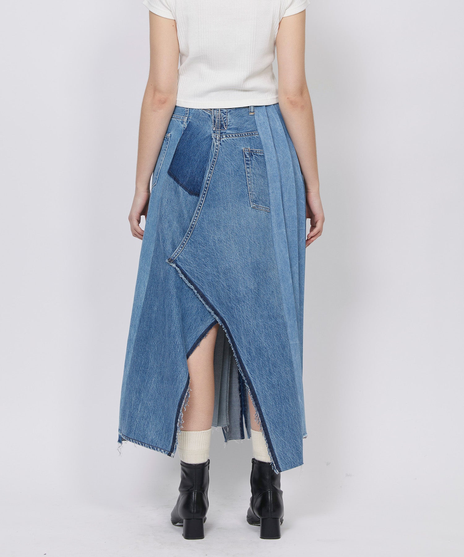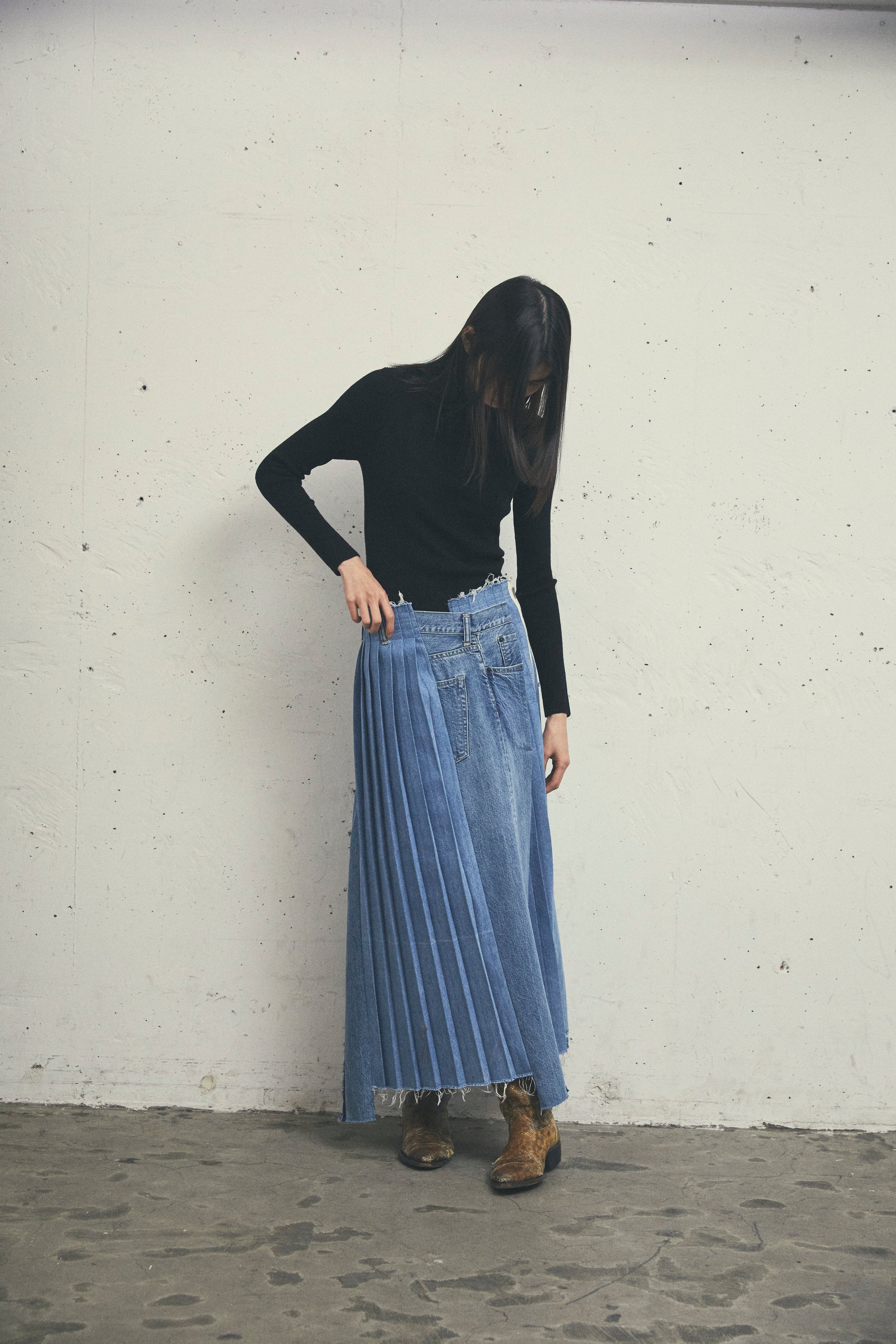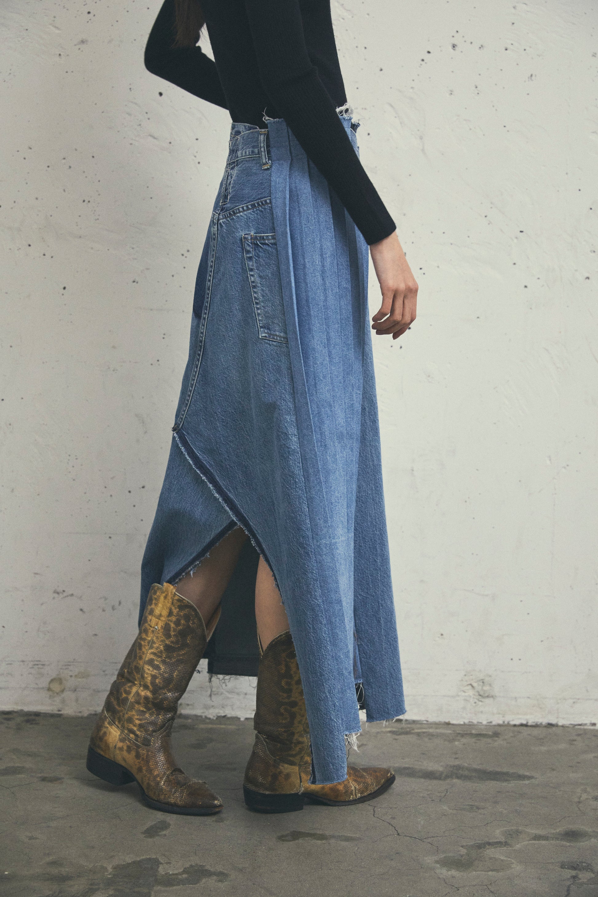 形状記憶されたコットン100%のプリーツを使用したリメイクプリーツスカート。デニムパンツを解体しプリーツを差し込み作りこまれる。アトリエにて職人が一人で全ての工程を縫い、組み合わせ仕上げています。鮮やかで深みのある色のデニムをベースにパンツ3本を解体し、縦のラインを生かした切り替えは、色を同色系に統一しトーンを抑えています。