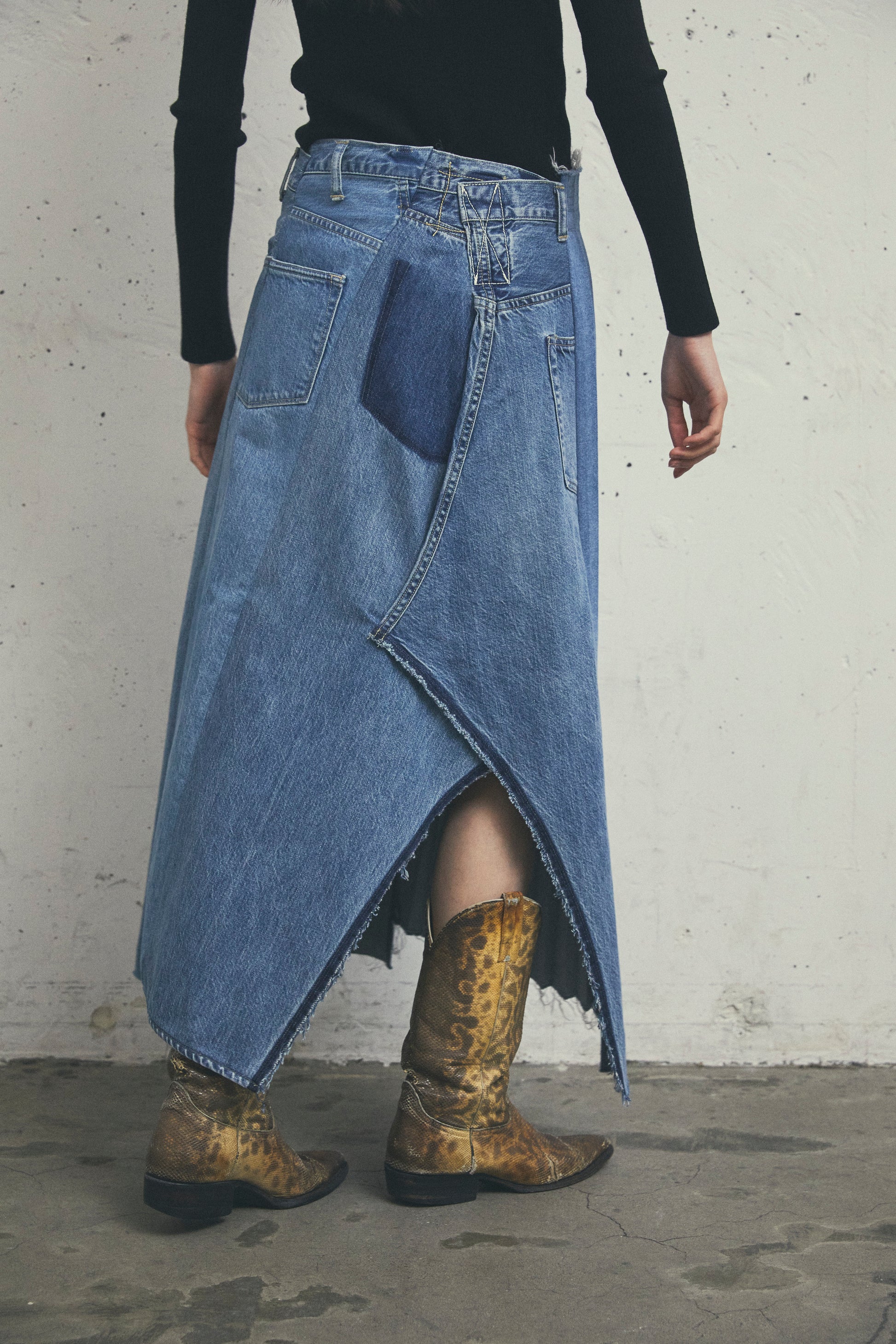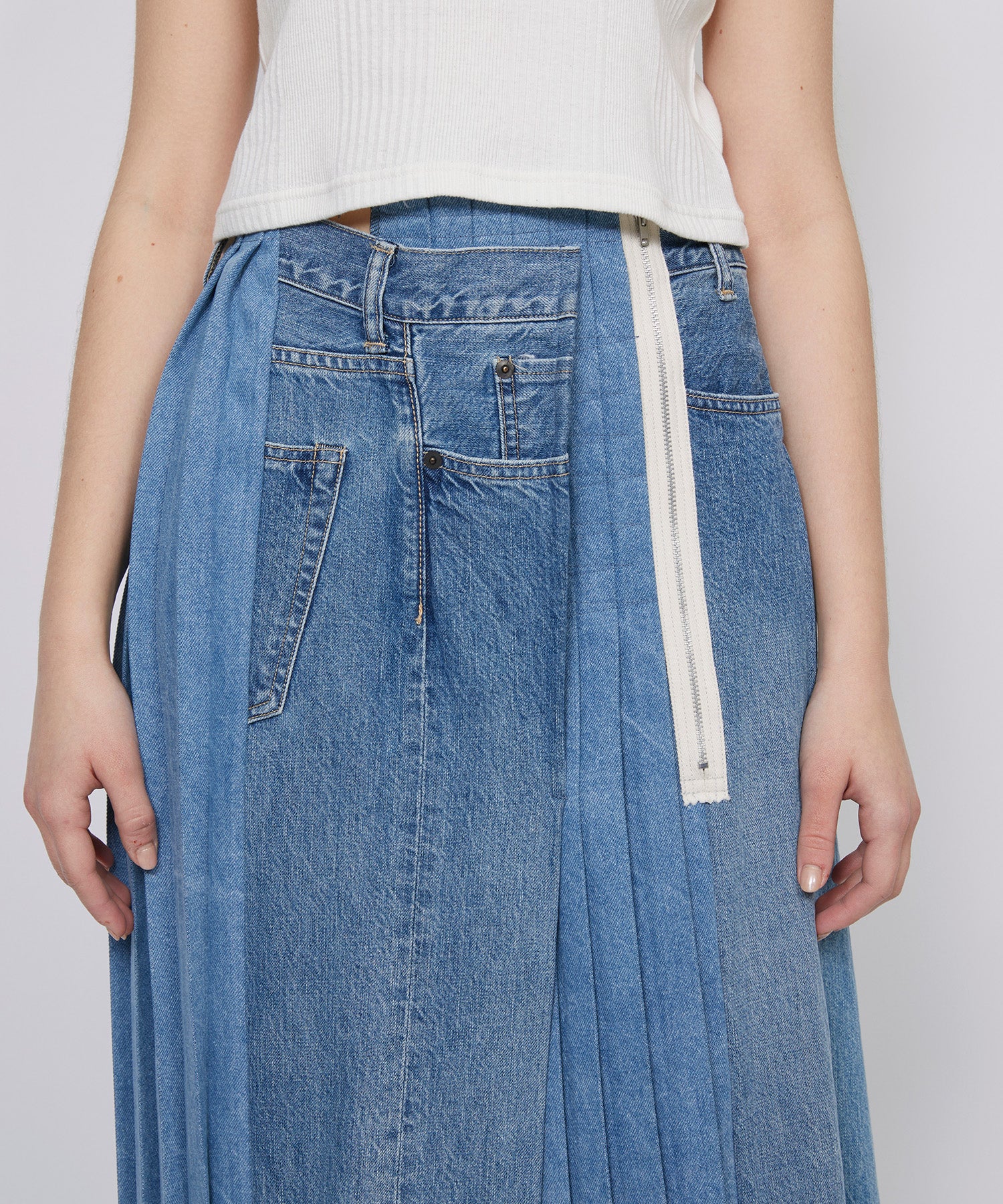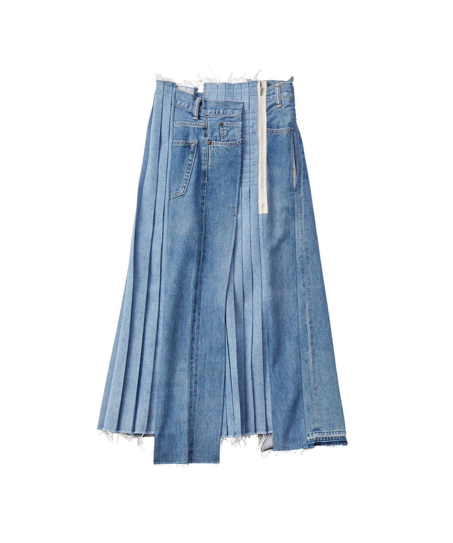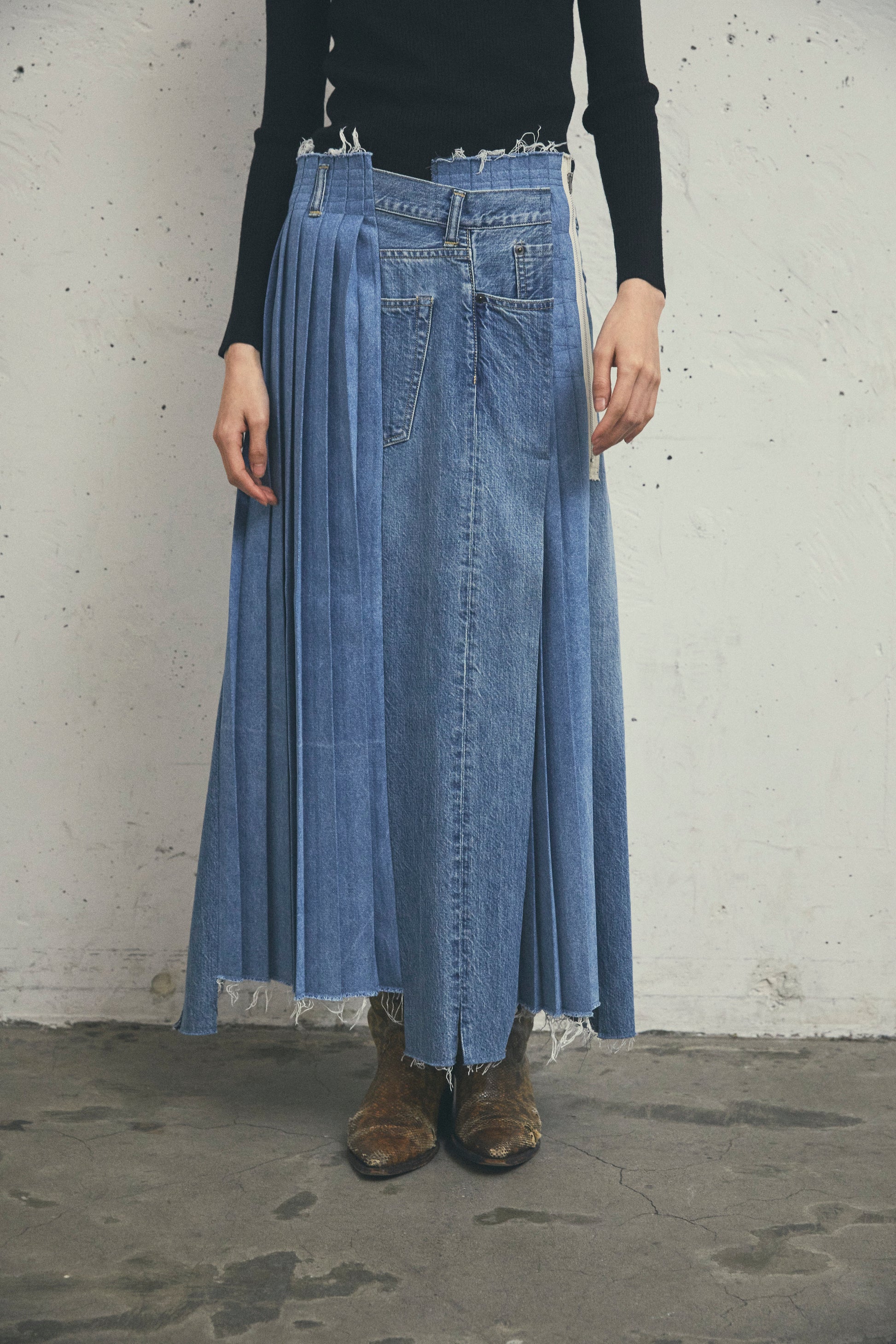 形状記憶されたコットン100%のプリーツを使用したリメイクプリーツスカート。デニムパンツを解体しプリーツを差し込み作りこまれる。アトリエにて職人が一人で全ての工程を縫い、組み合わせ仕上げています。鮮やかで深みのある色のデニムをベースにパンツ3本を解体し、縦のラインを生かした切り替えは、色を同色系に統一しトーンを抑えています。