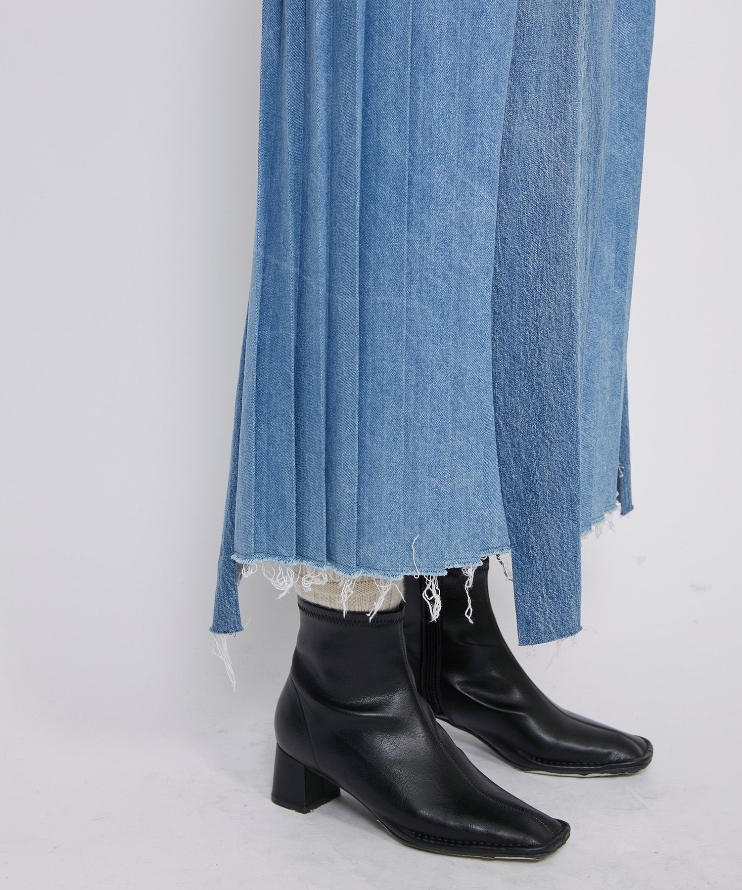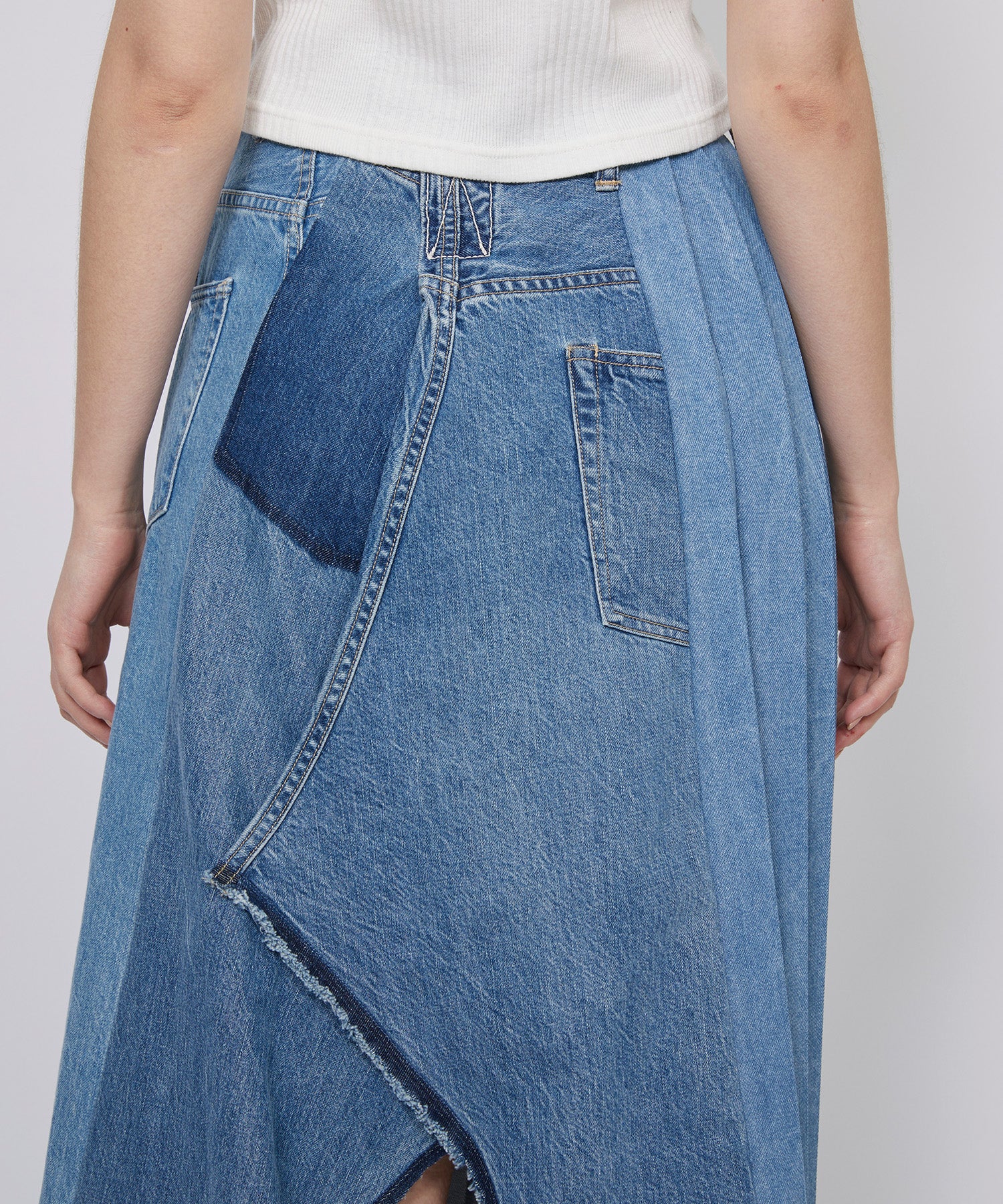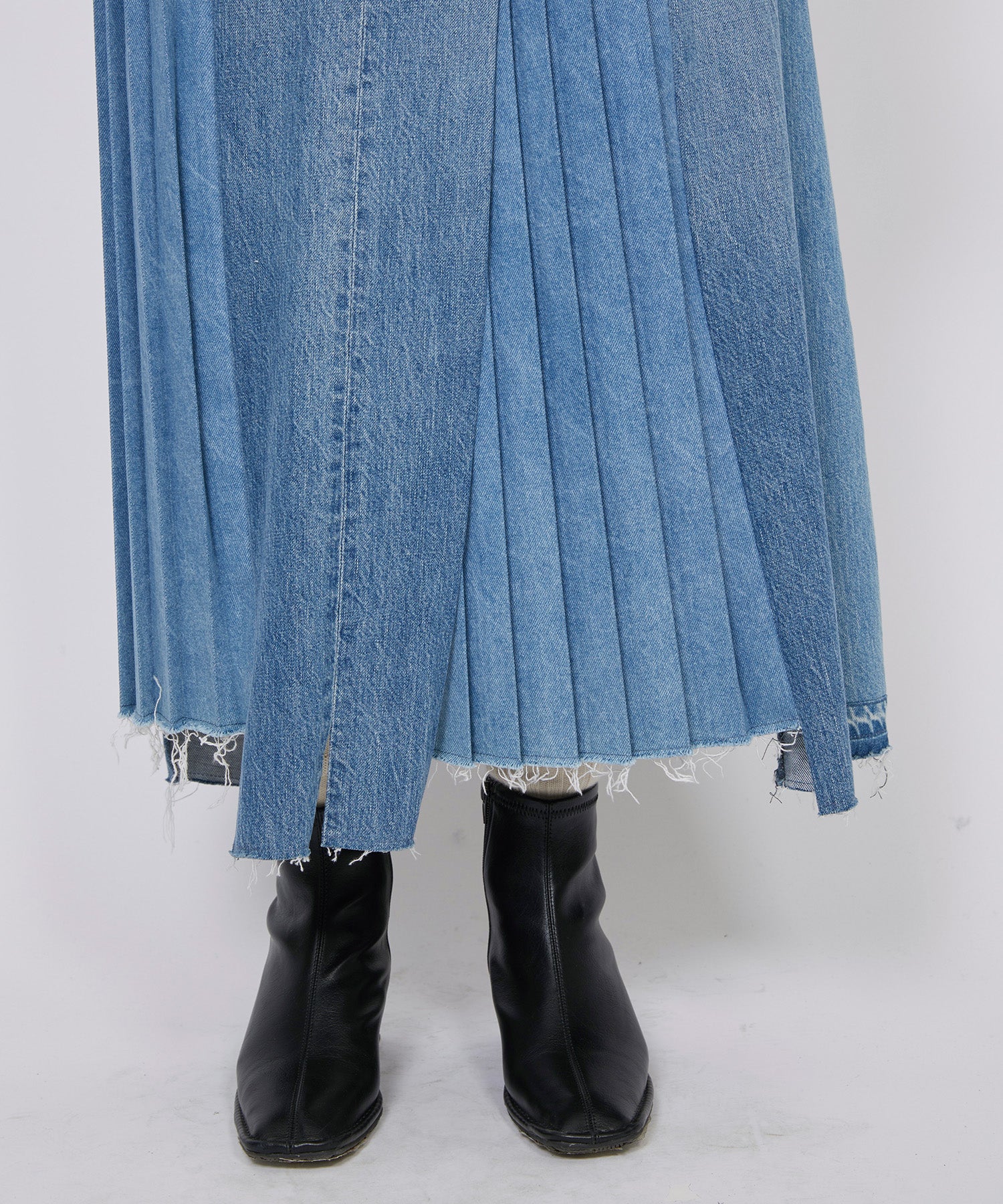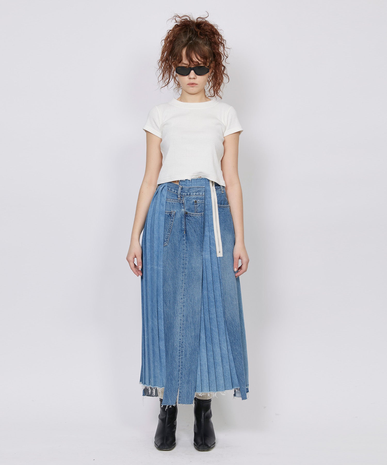 形状記憶されたコットン100%のプリーツを使用したリメイクプリーツスカート。デニムパンツを解体しプリーツを差し込み作りこまれる。アトリエにて職人が一人で全ての工程を縫い、組み合わせ仕上げています。鮮やかで深みのある色のデニムをベースにパンツ3本を解体し、縦のラインを生かした切り替えは、色を同色系に統一しトーンを抑えています。
