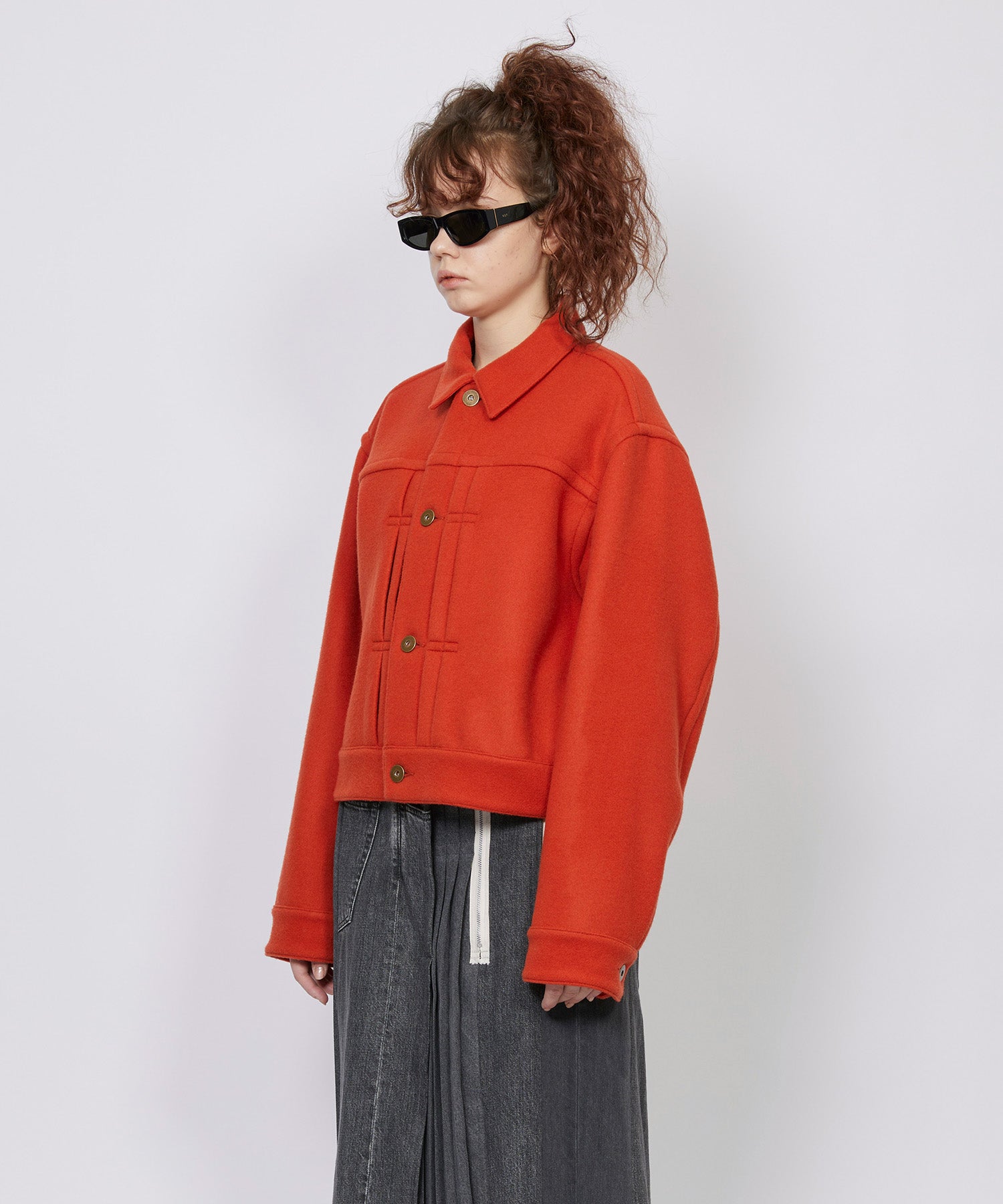 Crafted from premium Japanese Melton wool, this blouson blends denim jacket details with luxurious warmth and texture. The retro-inspired color palette and tailored fit offer both elegance and comfort. This piece embodies a blend of sophistication and casual style, exuding timeless appeal.