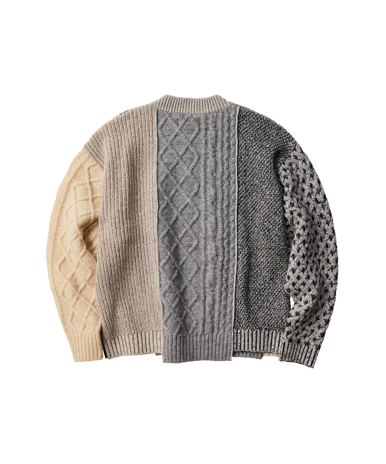 原料に拘った風合いの違う3種のWOOL100%の糸を使い、6種のそれぞれ違う編地を繋ぎ合わせたリメイクニット。