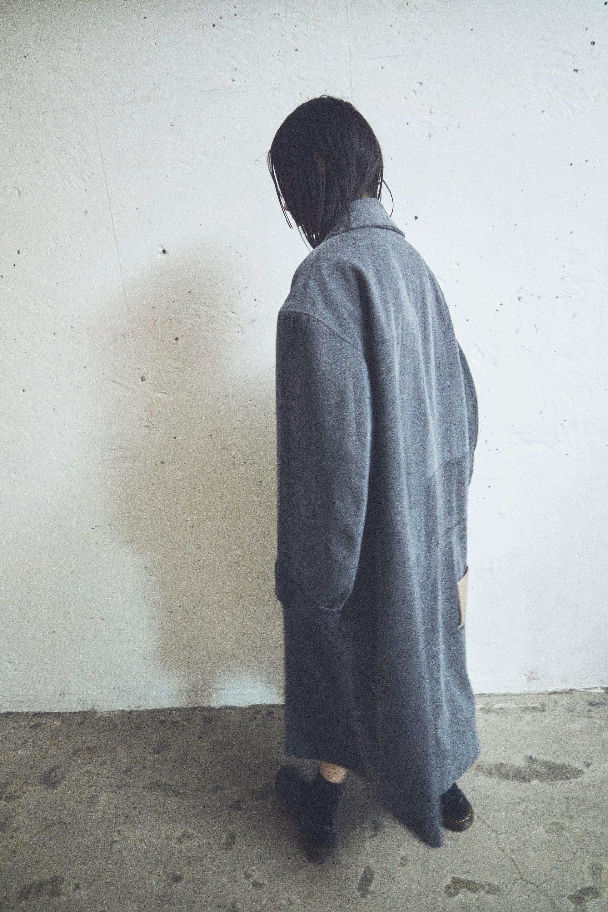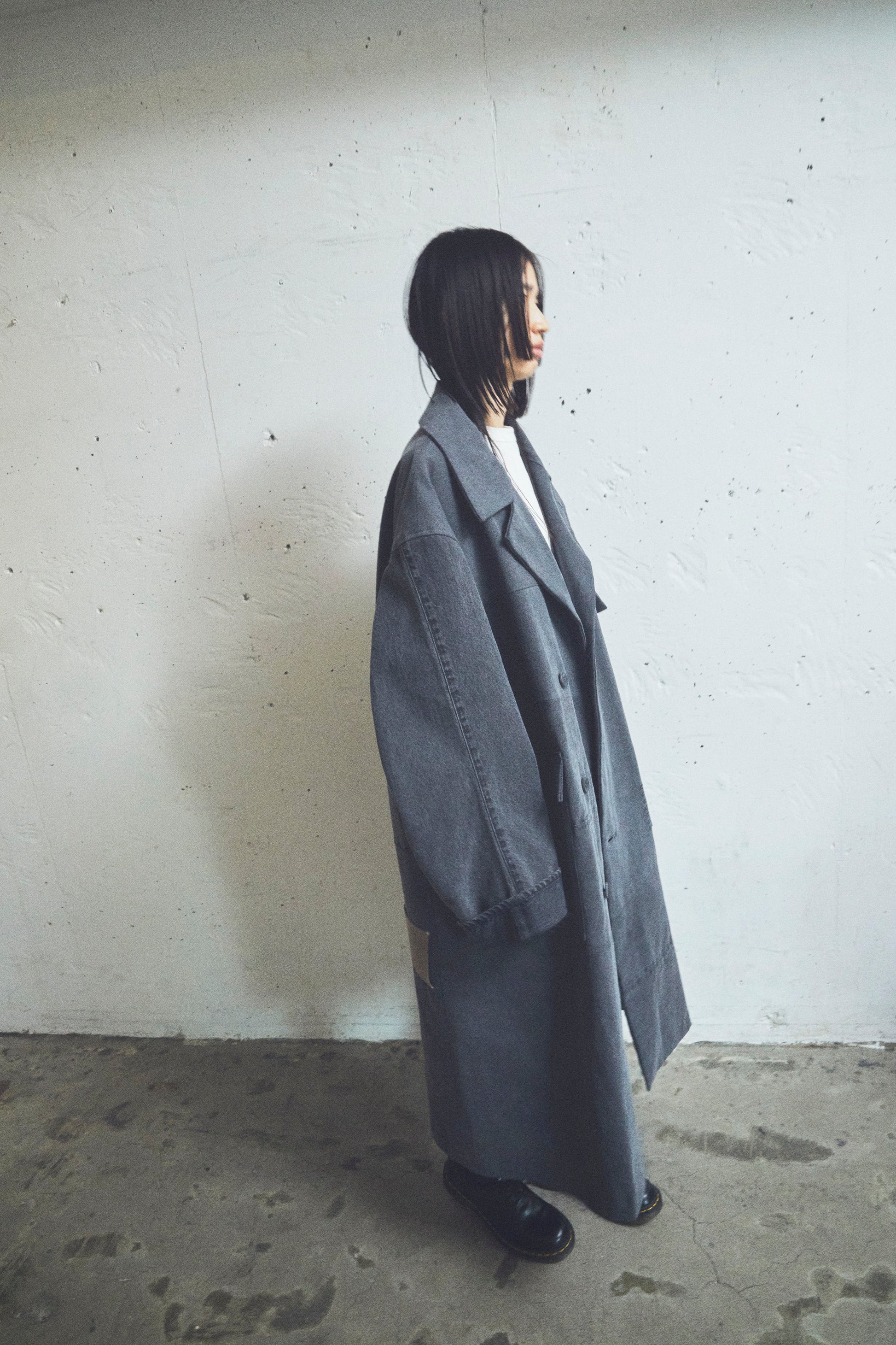 ルーズでリラックス感のあるフォルムながら、テーラードの要素を取り入れたデザインで、エレガントかつモダンな雰囲気を演出。動きの中で際立つ構築的なフォルムが印象的。