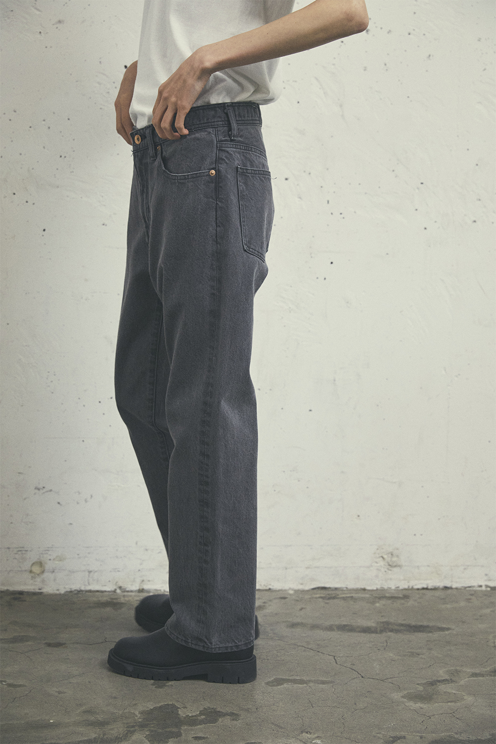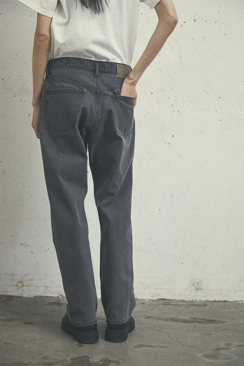 このデニムには、創業100年以上の歴史を持つ猪原織物が手掛けた12.5ozセルヴィッジデニムを採用。旧式シャトル織機による織布技術が生み出す、奥行きのある表情と優れた耐久性が特徴です。さらに、ムラ糸(太さにムラがある特殊な糸)を使用することで、デニム特有の立体感や経年変化の美しさが際立ちます。洗練されたテーパードシルエット