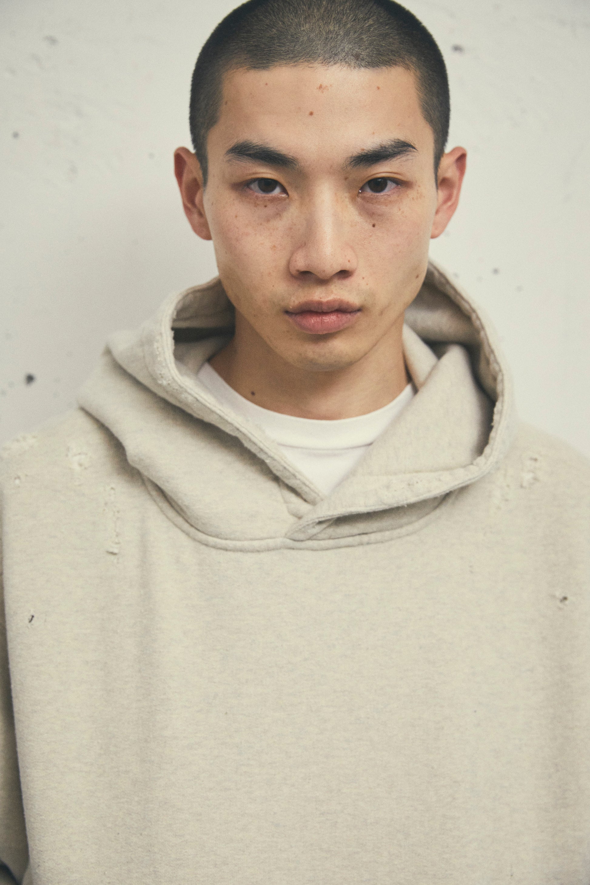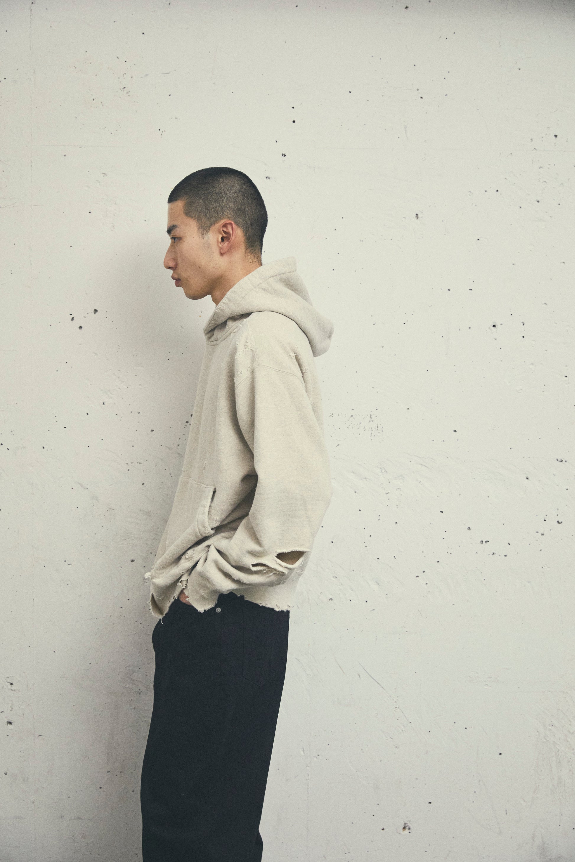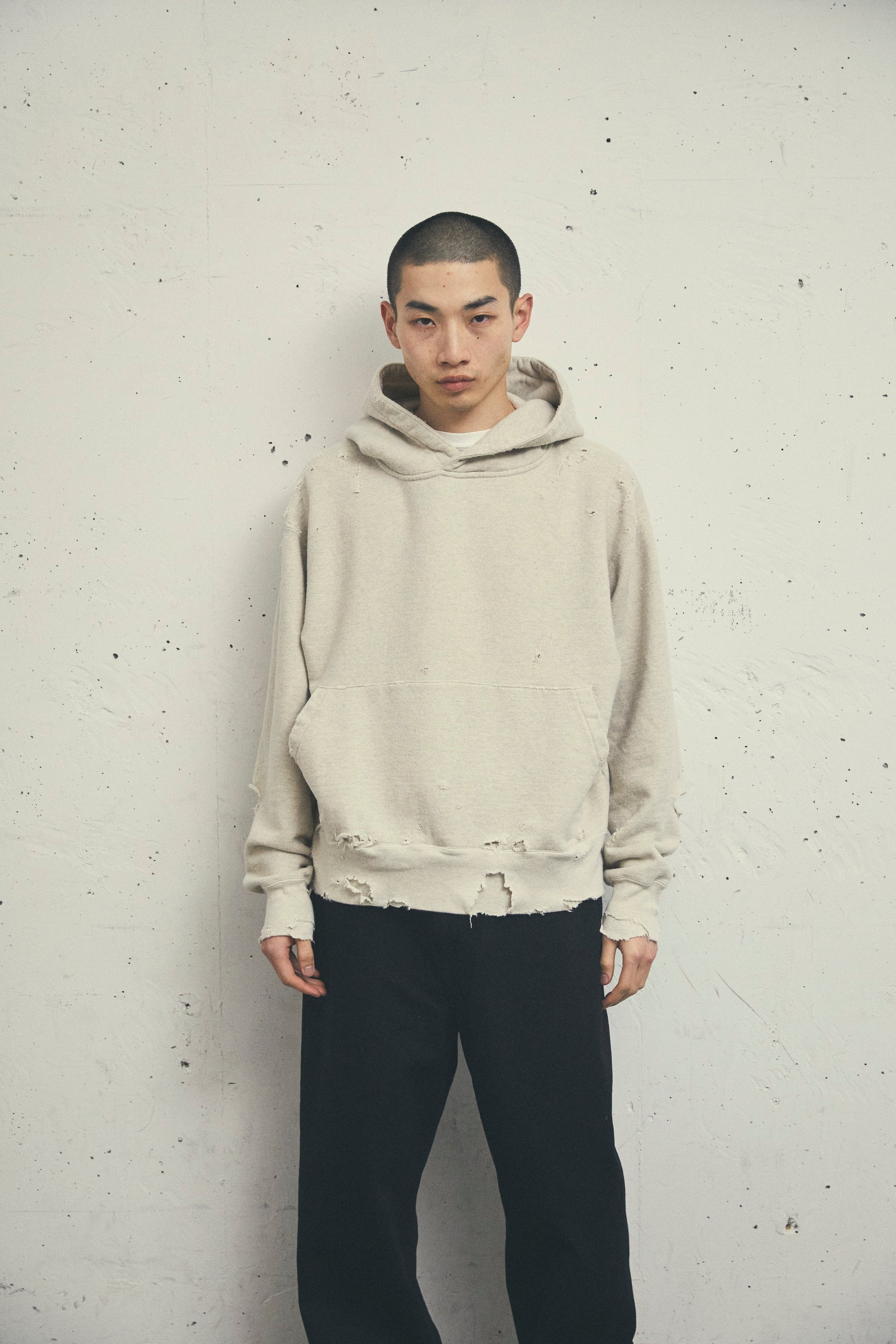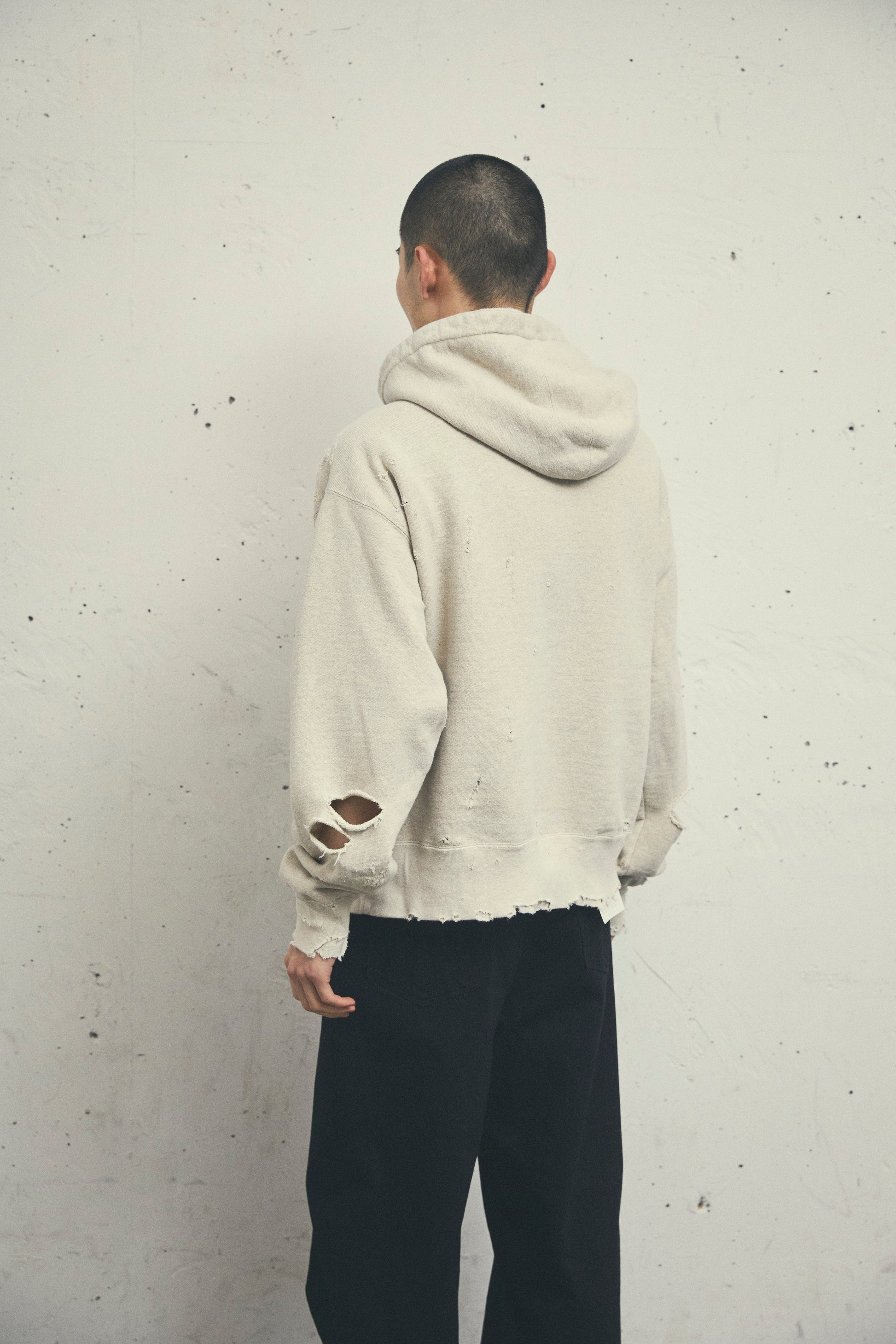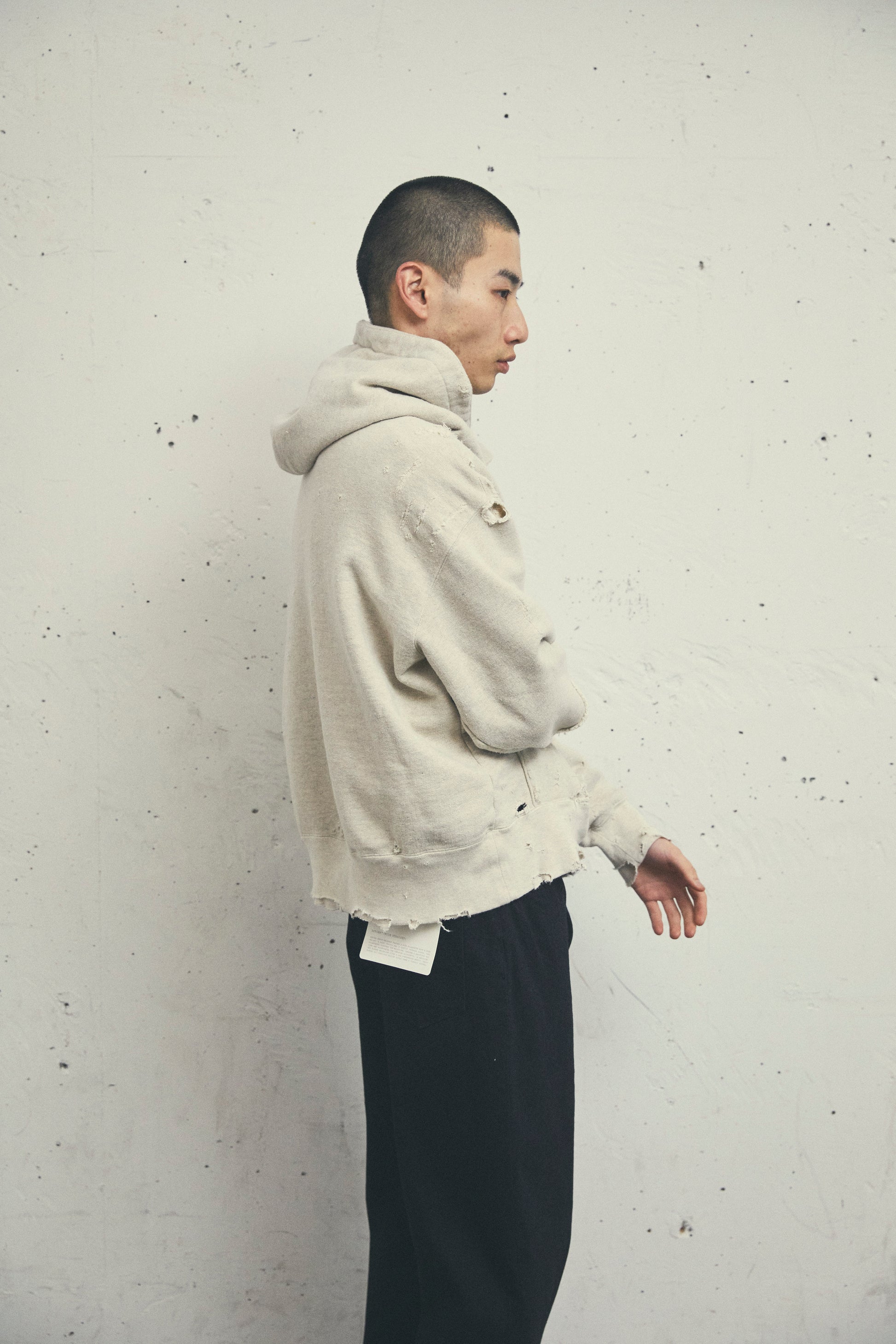 このダメージスウェットは、染め加工によって生まれる自然な風合いが特徴です。ダメージリペアが丁寧に施され、それぞれの部位に職人の手作業による修復が施され、一点ものの個性を際立たせています。製造には特殊な手法は一切使用されず、アナログな手法のみが用いられています。